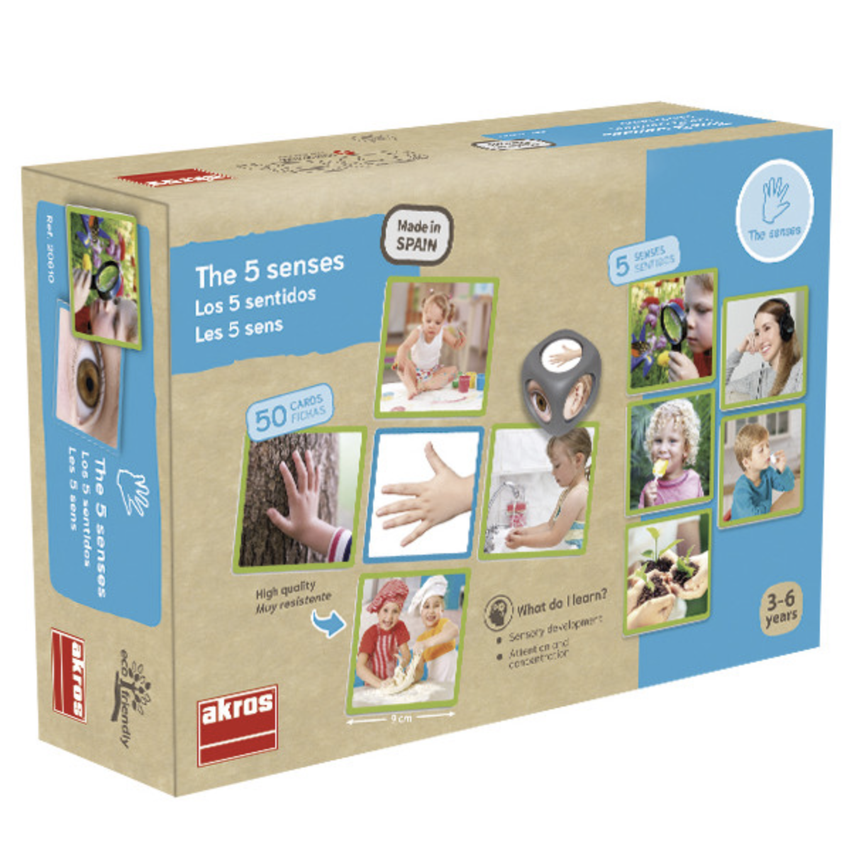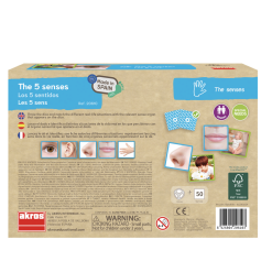 Există 50 de fotografii care ilustrează simțurile, dispuse pe 10 cartonașe principale (dublate), cu: